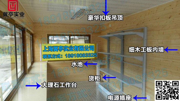 我們也可以看一下上面這張售貨亭內部布局的圖片,這個售貨亭就很好的考慮到了以后的需求,在售貨亭的角落設置的洗手臺盆,洗手臺盆過來是貨架,這個四層的貨架還是可以拆卸的,高度可以任意的調節,對以后的使用是非常的方便。