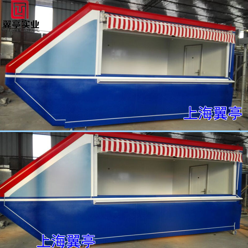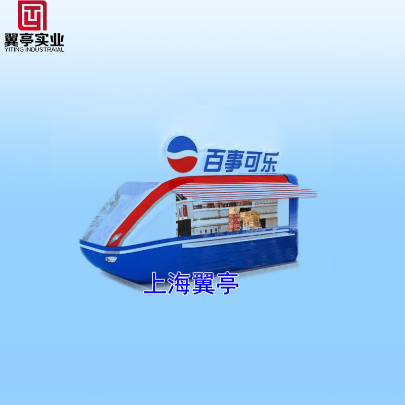 YT-S13動車頭售貨亭造型別致、整體設計采用仿造動車頭的外觀形式款式美觀、大氣 采用藍白相搭配的的外觀色彩、給人舒適的視覺享受、這樣的售貨亭無論是擺放在哪里、都會是城市中的風景線、在動車頭售貨亭的頂部還有裝有廣告燈箱、向廣大市民展示更多的信息。里面的配套設施也很完善、有工作臺、燈飾、插座等!