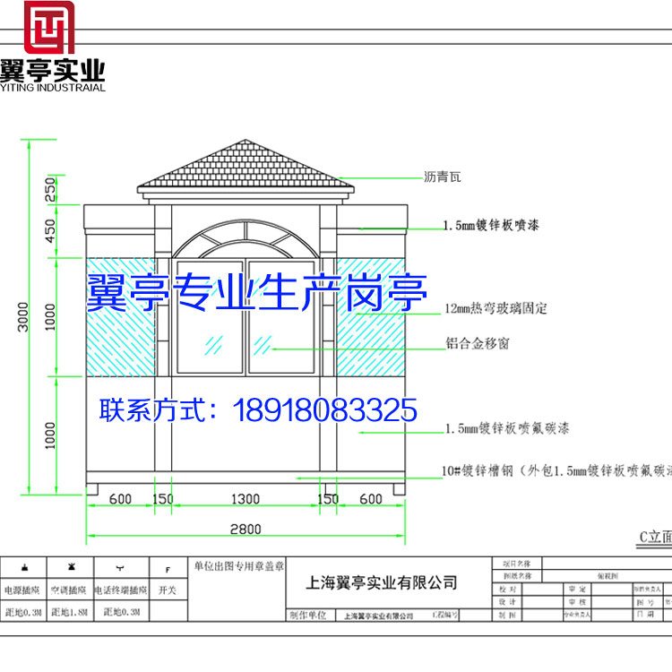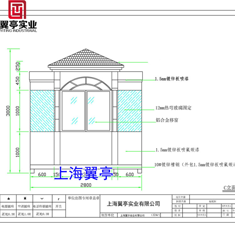 框架:崗亭立柱為12#槽鋼、100*100*3mm鍍鋅方管、表面2mm鍍鋅板噴涂氟碳漆;