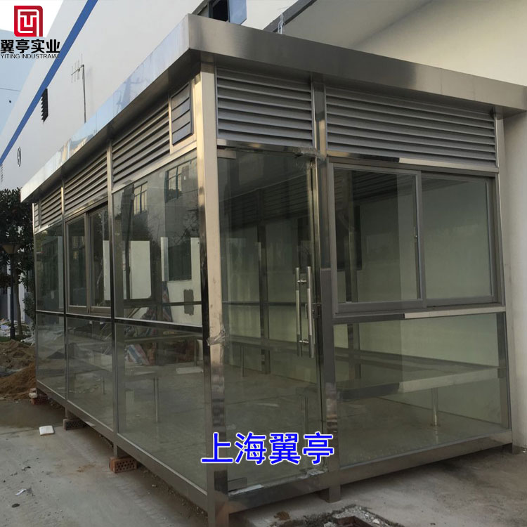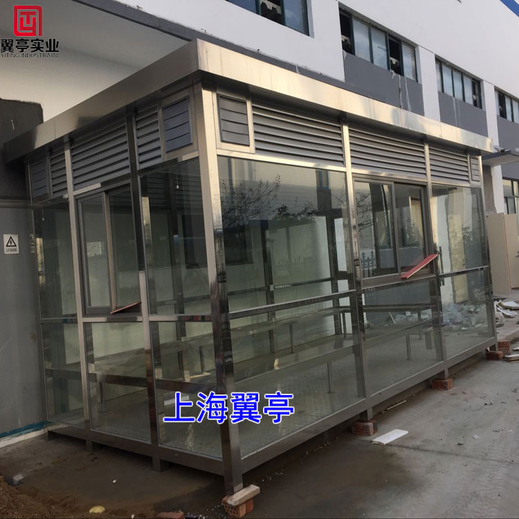 不銹鋼吸煙亭、簡捷方便:輕鋼結構,整體制作,放下后即可使用,如有必要,還可吊換地點使用方便靈活、吸煙亭采用不銹鋼為立柱鋼化玻璃為墻體、自重合理牢固耐用!