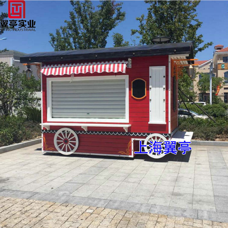 主要特點: 防腐木售貨亭在制作工藝上采用防腐木為主材內置鋼結構整體焊接成型牢固耐用、整體形象設計仿造小推車、外帶裝飾滑輪、精美、