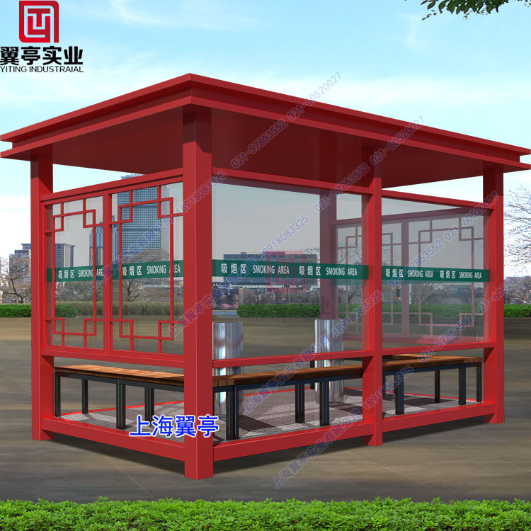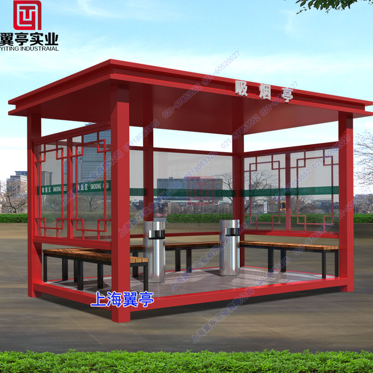 主要特點: 上海翼亭崗亭廠家新款吸煙亭、款式精美大氣、采用敞開式設計風格、非常適合一些戶外城市使用,這款吸煙亭也是我們給青島煙草局定制吸煙亭。