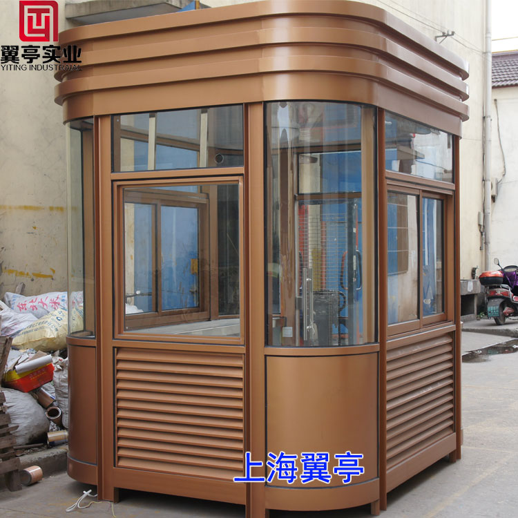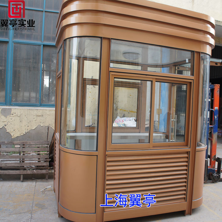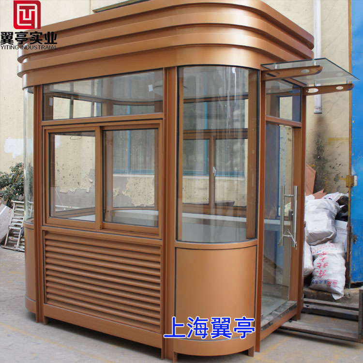 YT-G03新款鋼結構崗亭、四個橢圓弧采用熱彎鋼化玻璃和鍍鋅板巧妙相結合、襯托整個鋼結構崗亭款式別致、外墻采用金棕色氟碳漆色澤明亮、使整個鋼結構崗亭成為小區一道靚麗的風景線、